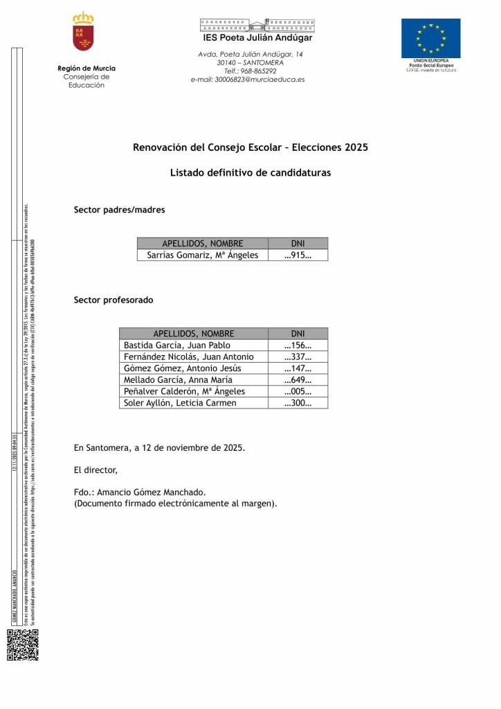 ELECCIONES AL CONSEJO ESCOLAR 2025. LISTADO DEFINITIVO DE CANDIDATURAS. VOTACIONES